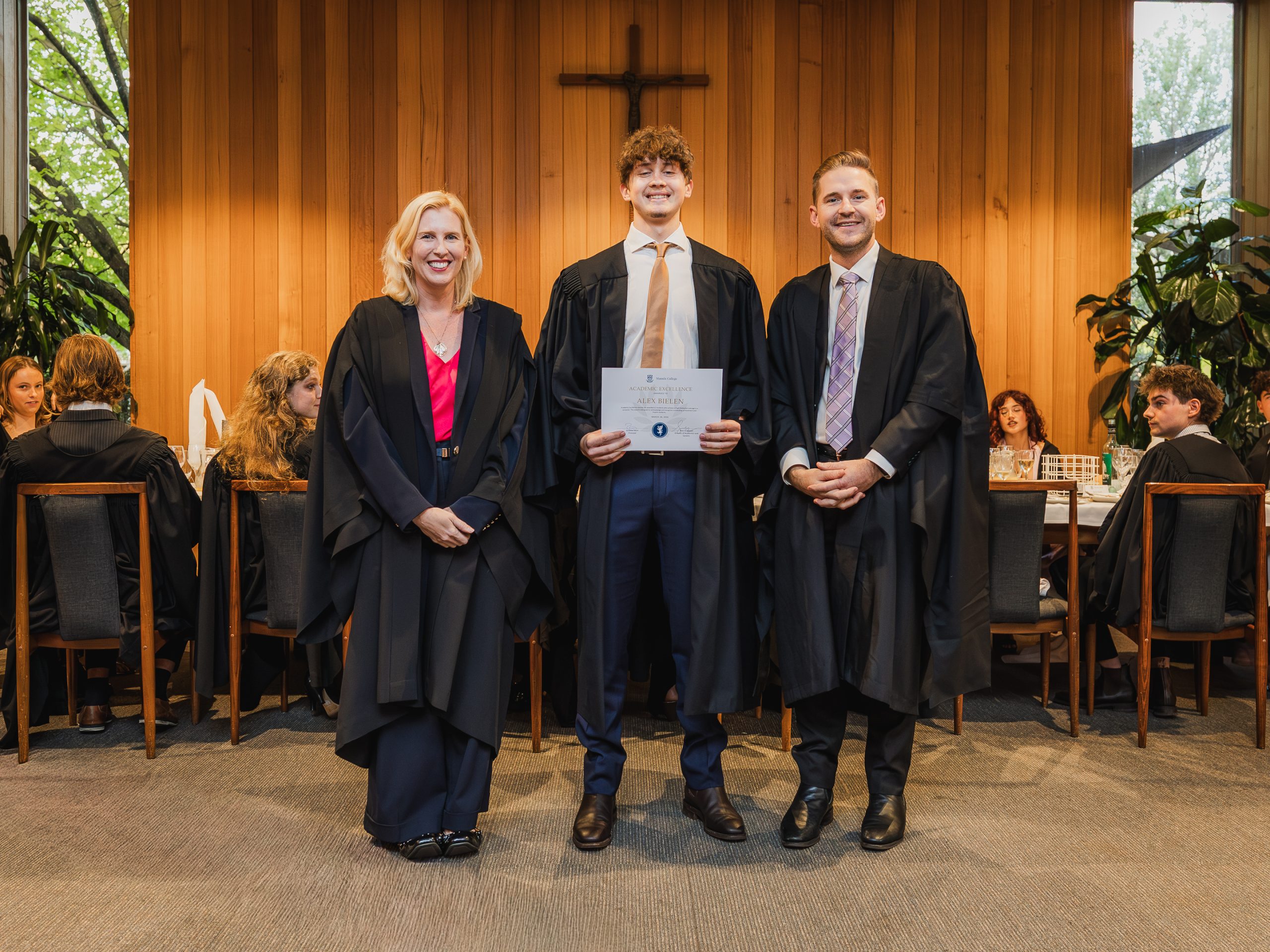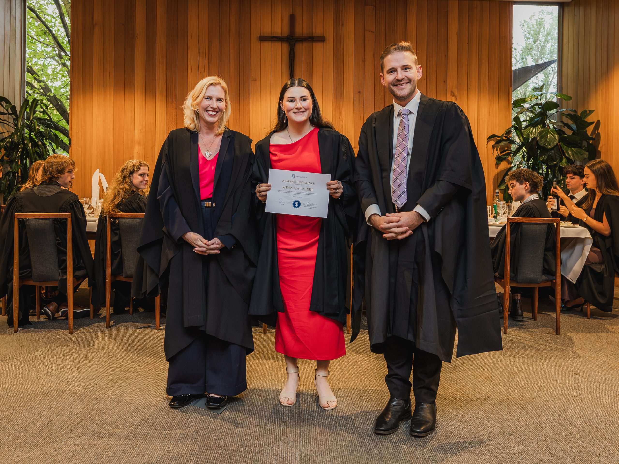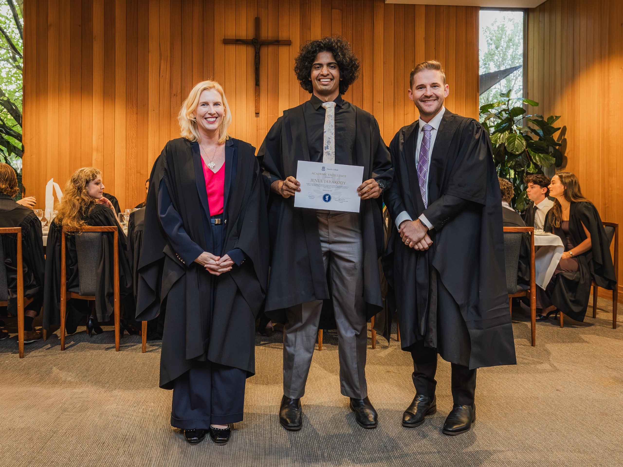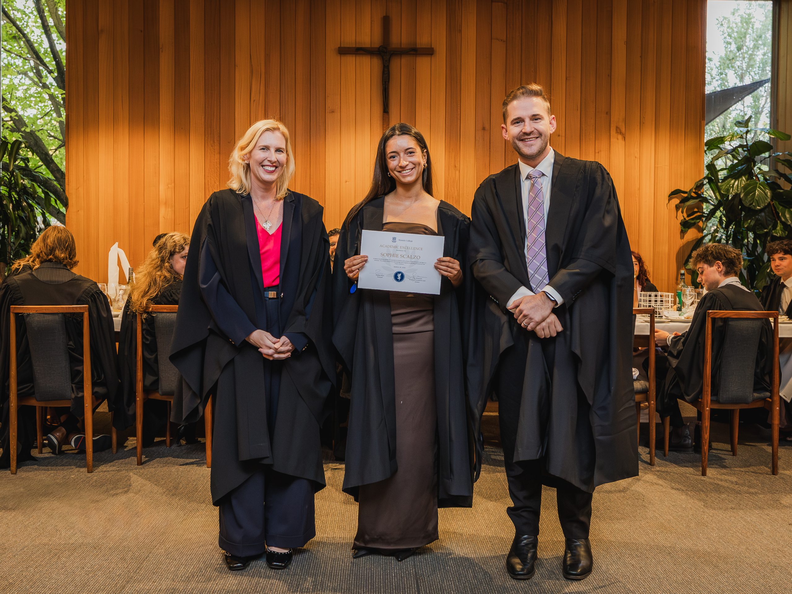 This year, the College recognised 52 students with Academic Awards, alongside 11 recipients of the prestigious Knox Scholarships. Named in honour of Cardinal James Robert Knox, Archbishop of Melbourne from 1967 to 1974, the scholarships commemorate his role in blessing and laying the College’s foundation stone on 23 May 1968. Each scholarship is awarded to the highest-performing resident within their faculty and includes a $1000 prize, generously supported by the Catholic Archdiocese of Melbourne. In addition, students who achieved a High Distinction average in their Semester 2 studies were presented with Academic Excellence Awards. These honours reflect not only individual dedication and discipline but also the supportive academic environment cultivated within the College.