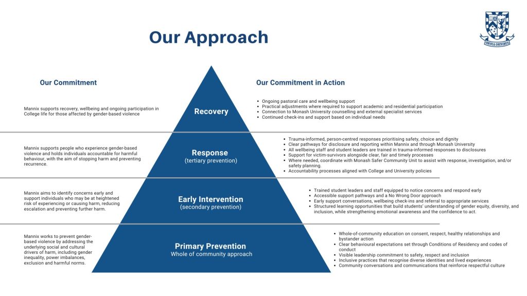 In line with the National Higher Education Code to Prevent and Respond to Gender-Based Violence, Mannix College has a Whole-of-Organisation Plan that outlines how we prevent harm, support our community, and respond to concerns within the residential environment.